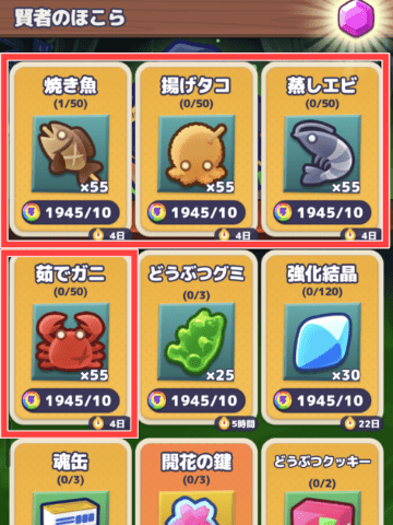 • 強化素材(焼き魚・揚げタコ・蒸しエビ・茹でカニ)※冒険メダルが余ったら