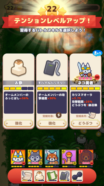 テンションを拾ってゲージが貯まると「テンションレベル」が上昇し、レベルが上がるたびに「スキル」や「どうぶつ」を獲得できます。