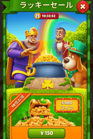 左の画像の「ショップ」は、ホーム上部のコインをタップすると出てきます。右の画像は、期間限定のセールアイテムです。時期によって内容が異なります。